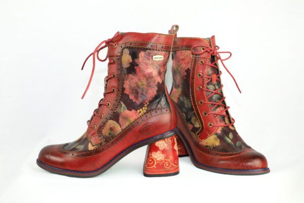 Su tono rojo pardo, profundo y cálido, se combina con un estampado floral que evoca hojas secas y texturas de otoño. El diseño de cordones estilo militar añade estructura y estabilidad, mientras que el tacón ancho —ligeramente escultórico— ofrece comodidad sin renunciar a un punto de sofisticación. Es una bota versátil para llevar con faldas de lana, pantalón recto o tejidos denim, perfecta para los días fríos en los que buscas una presencia segura y natural.