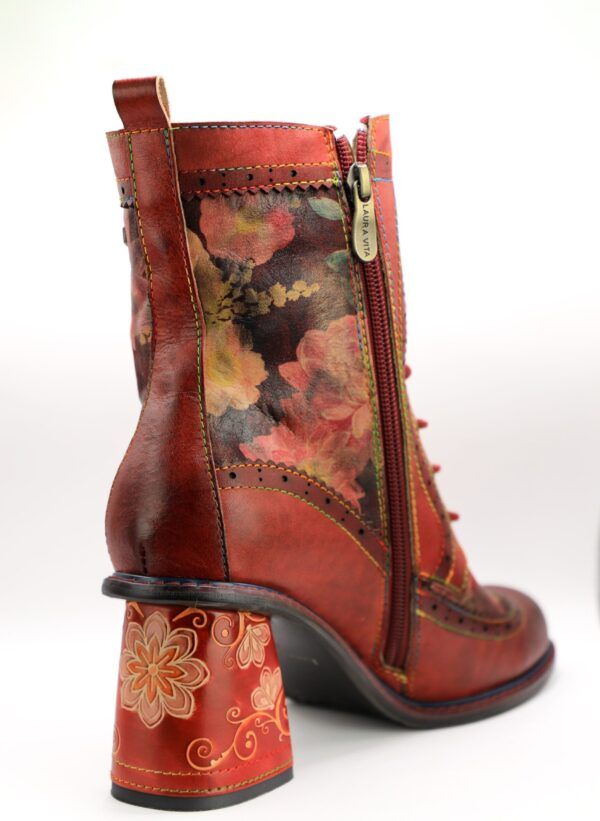 Su tono rojo pardo, profundo y cálido, se combina con un estampado floral que evoca hojas secas y texturas de otoño. El diseño de cordones estilo militar añade estructura y estabilidad, mientras que el tacón ancho —ligeramente escultórico— ofrece comodidad sin renunciar a un punto de sofisticación. Es una bota versátil para llevar con faldas de lana, pantalón recto o tejidos denim, perfecta para los días fríos en los que buscas una presencia segura y natural.