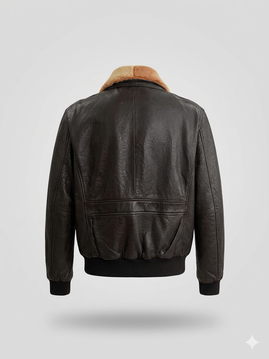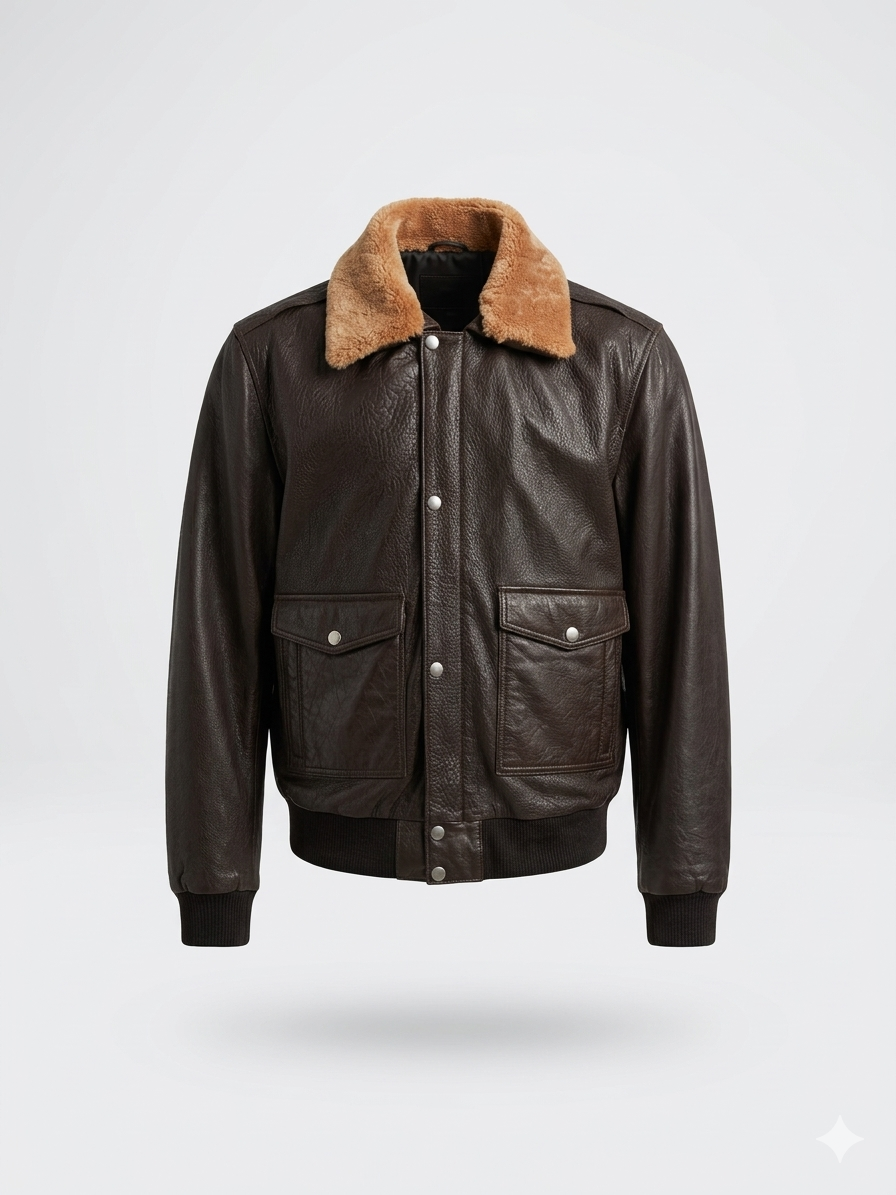 Su cuello ancho de pelo suave —desmontable— aporta calidez y un contraste sutil con el tono chocolate profundo del cuero. Los puños y la cintura elásticos aseguran un ajuste perfecto, mientras que los bolsillos frontales y el de manga evocan la funcionalidad militar reinterpretada con elegancia.