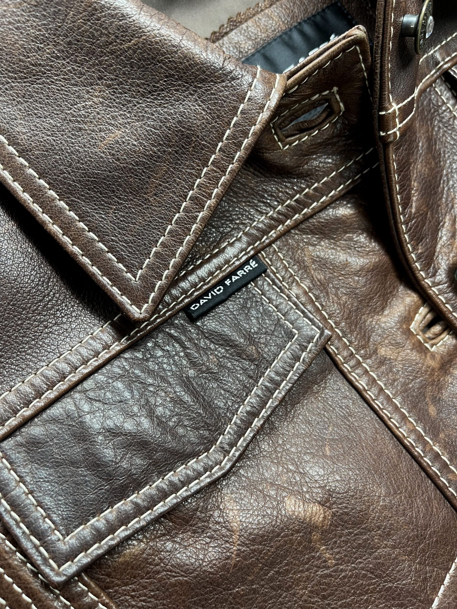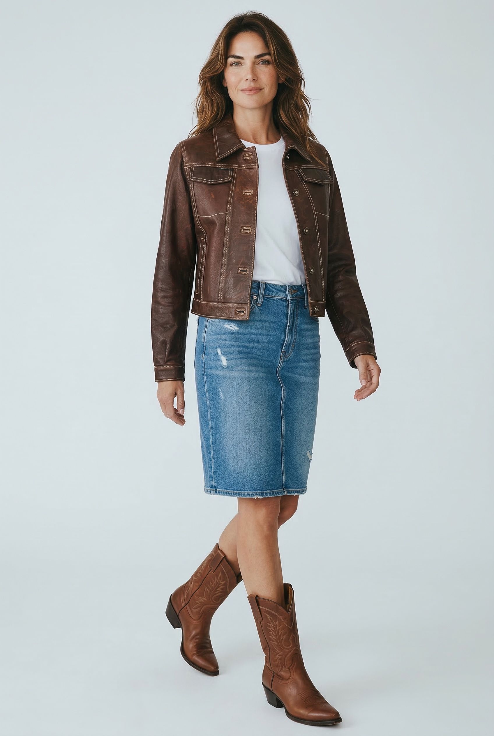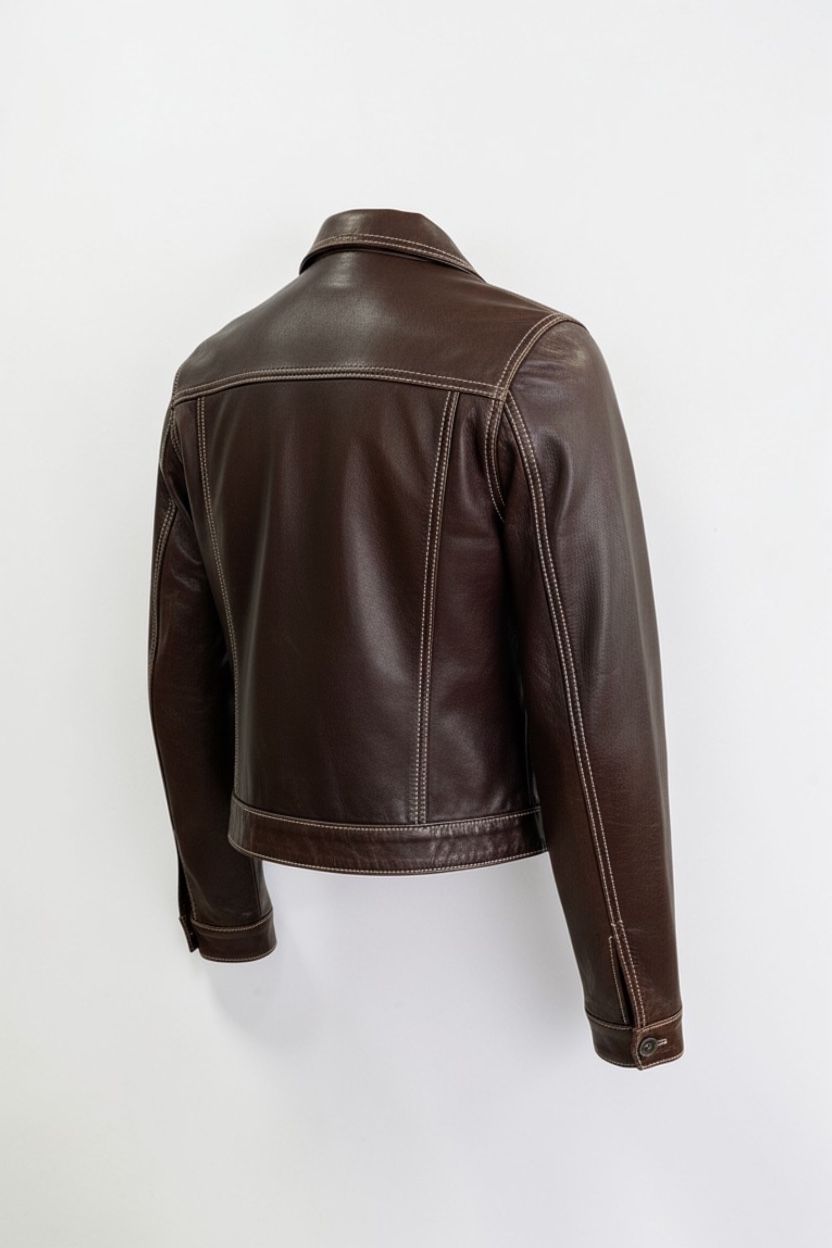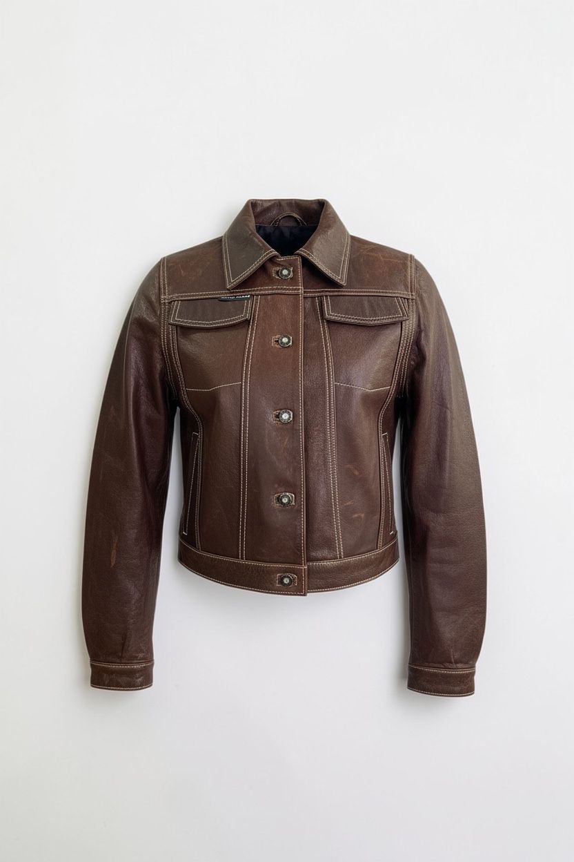 TEJANA MUJER es una chaqueta de piel artesanal que reinterpreta con elegancia el clásico tejano en clave femenina. Su corte recto y las costuras visibles aportan fuerza y autenticidad, mientras que el tono marrón intenso de la piel natural añade calidez y carácter único a cada prenda.