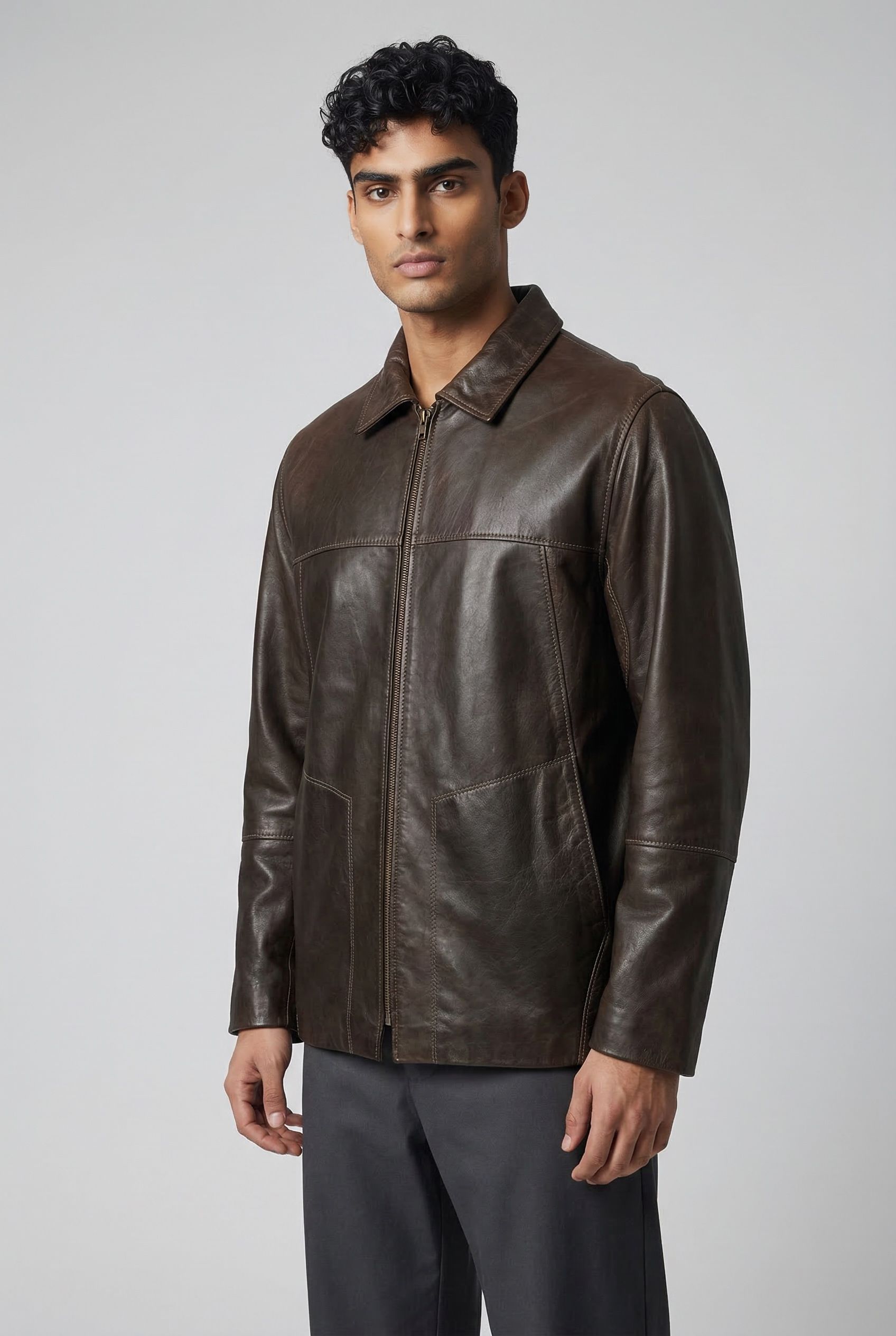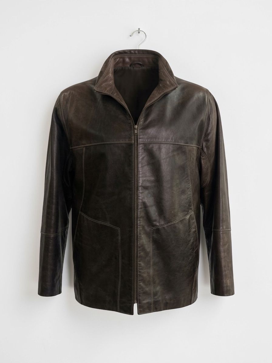 Con corte recto y caída natural, esta chaqueta de cuero se adapta al movimiento sin perder estructura. El cuello clásico, el cierre de cremallera metálica y los bolsillos invisibles le dan un aire práctico pero refinado.